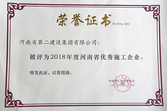 B体育(中国)荣获“2018年度河南省优秀施工企业”